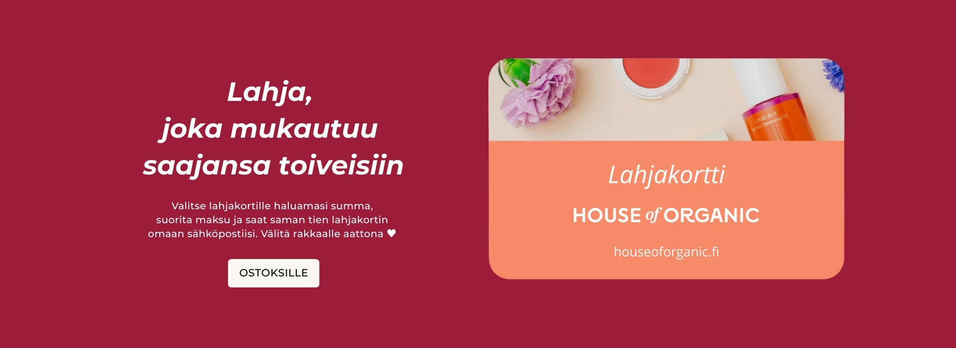 House of Organic on 100% suomalainen kosmetiikan verkkokauppa, josta löydät luonnollisen kauneuden suosituimmat tuotteet, joita ihosi janoaa ja sinä rakastat!