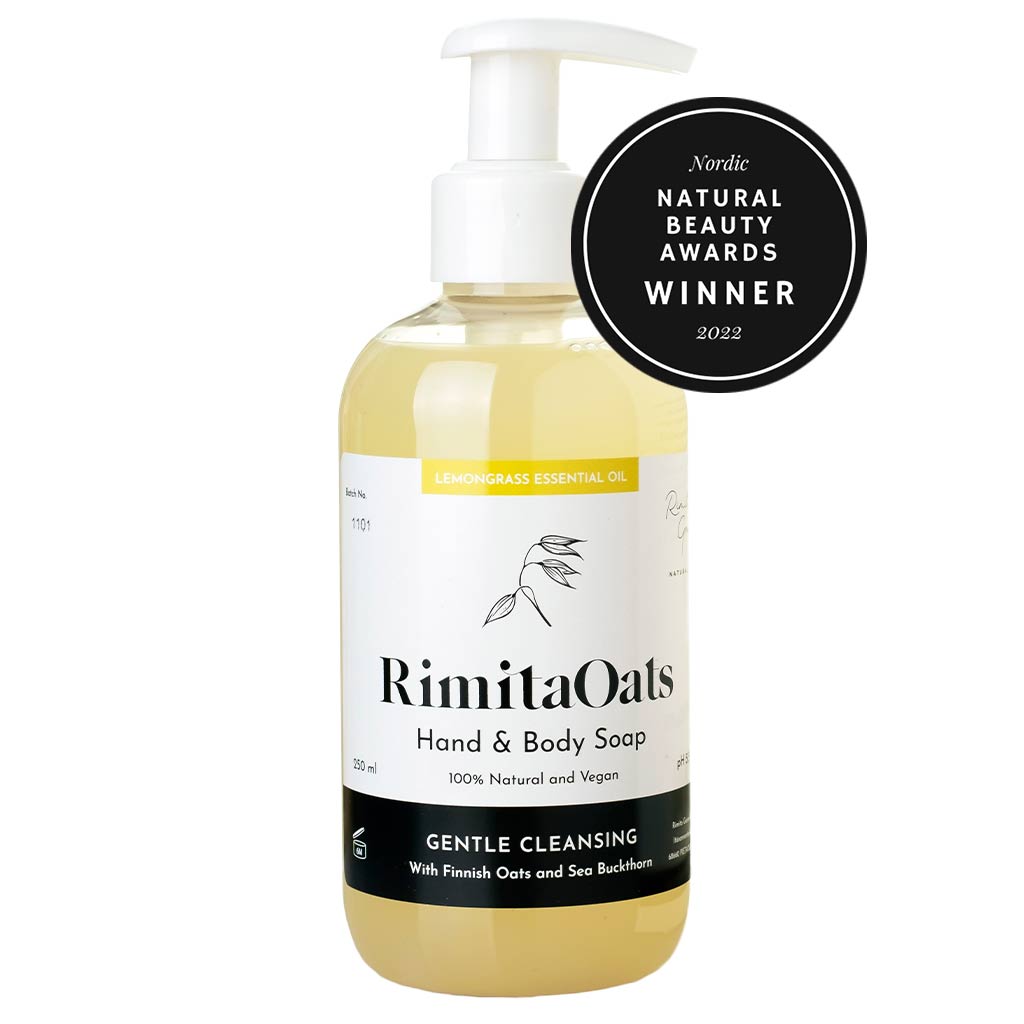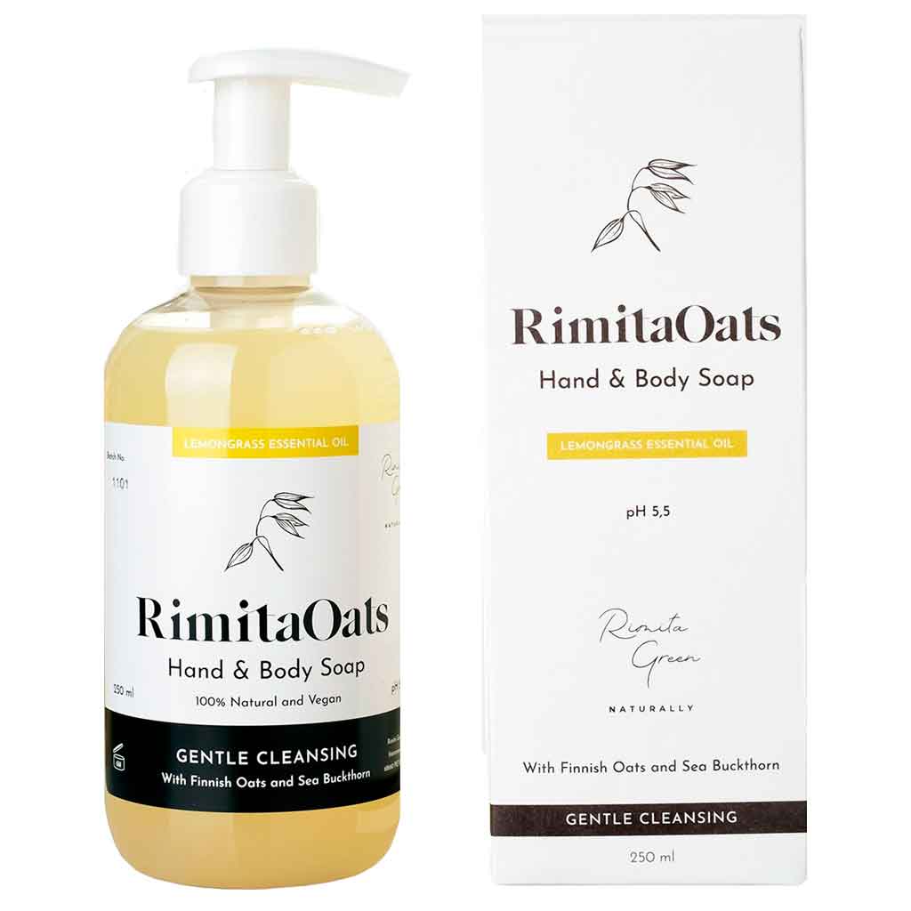 Hellävarainen ja kotimainen RimitaOats käsisaippua puhdistaa käsien ja vartalon ihon tehokkaasti ilman kuivattavaa vaikutusta. Kosteuttava ja ravitseva koostumus jättää iholle silkkisen pehmeän tunteen. Kotimainen kauraöljy hoitaa ja ravitsee ihoa. Kotimainen tyrniöljy hoitaa ja pehmentää ihoa. Tyrniöljy sisältää runsaasti omegarasvahappoja ja A-, C- ja E-vitamiineja, jotka ravitsevat, pehmentävät ja suojaavat ihoa vapailta radikaaleilta.