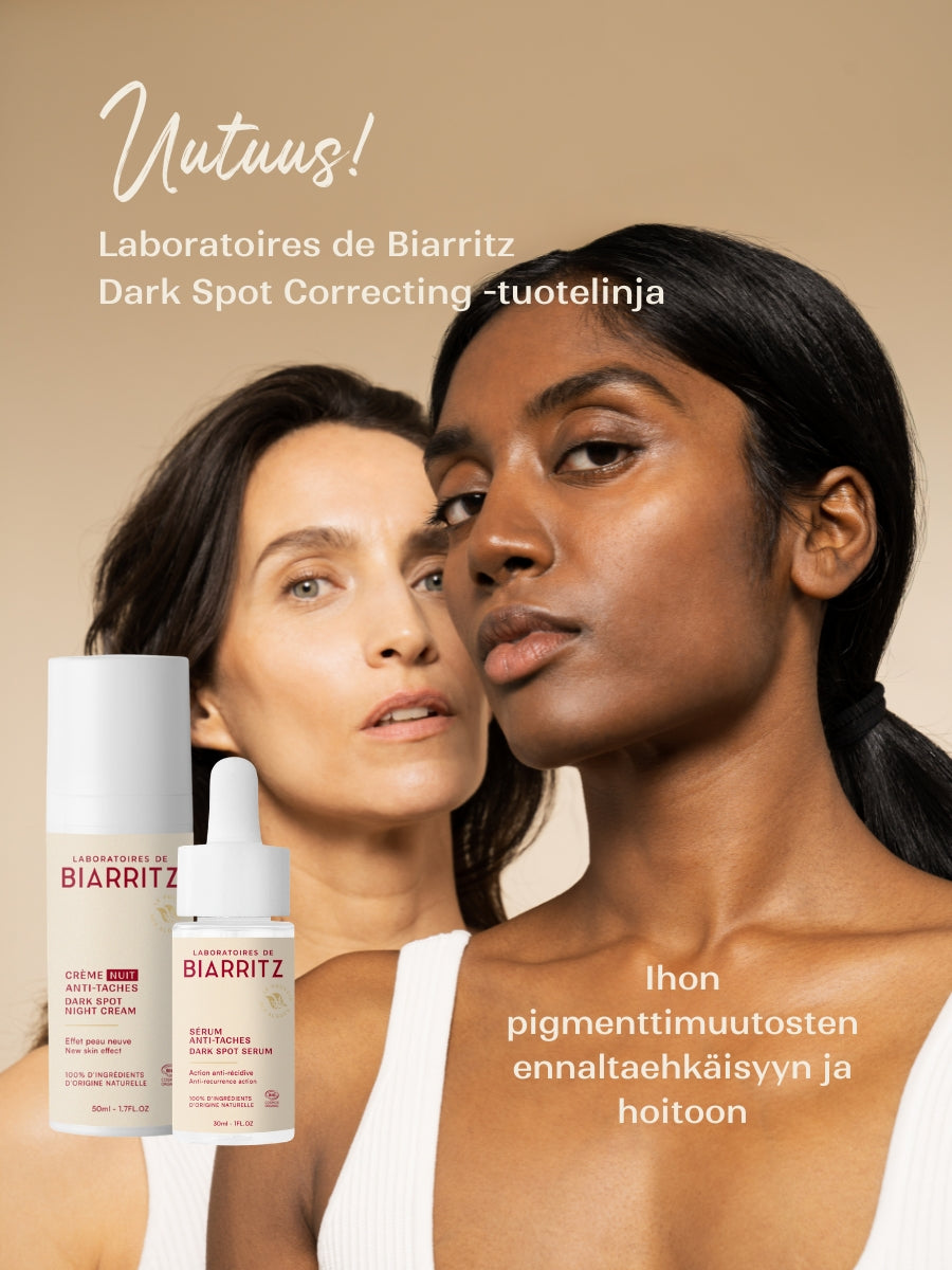 Laboratoires de Biarritz Dark Spot Correcting –tuotelinja korjaa ihoon jo muodostuneita pigmenttiläiskiä ja ennaltaehkäisee uusien syntyä. Linjan kaksi ensimmäistä tuotetta, Dark Spot Correcting Seerumi ja Yövoide, tukevat ihon luonnollista tasapainoa ja hyödyntävät levien voimaa pigmenttimuutosten hoidossa.