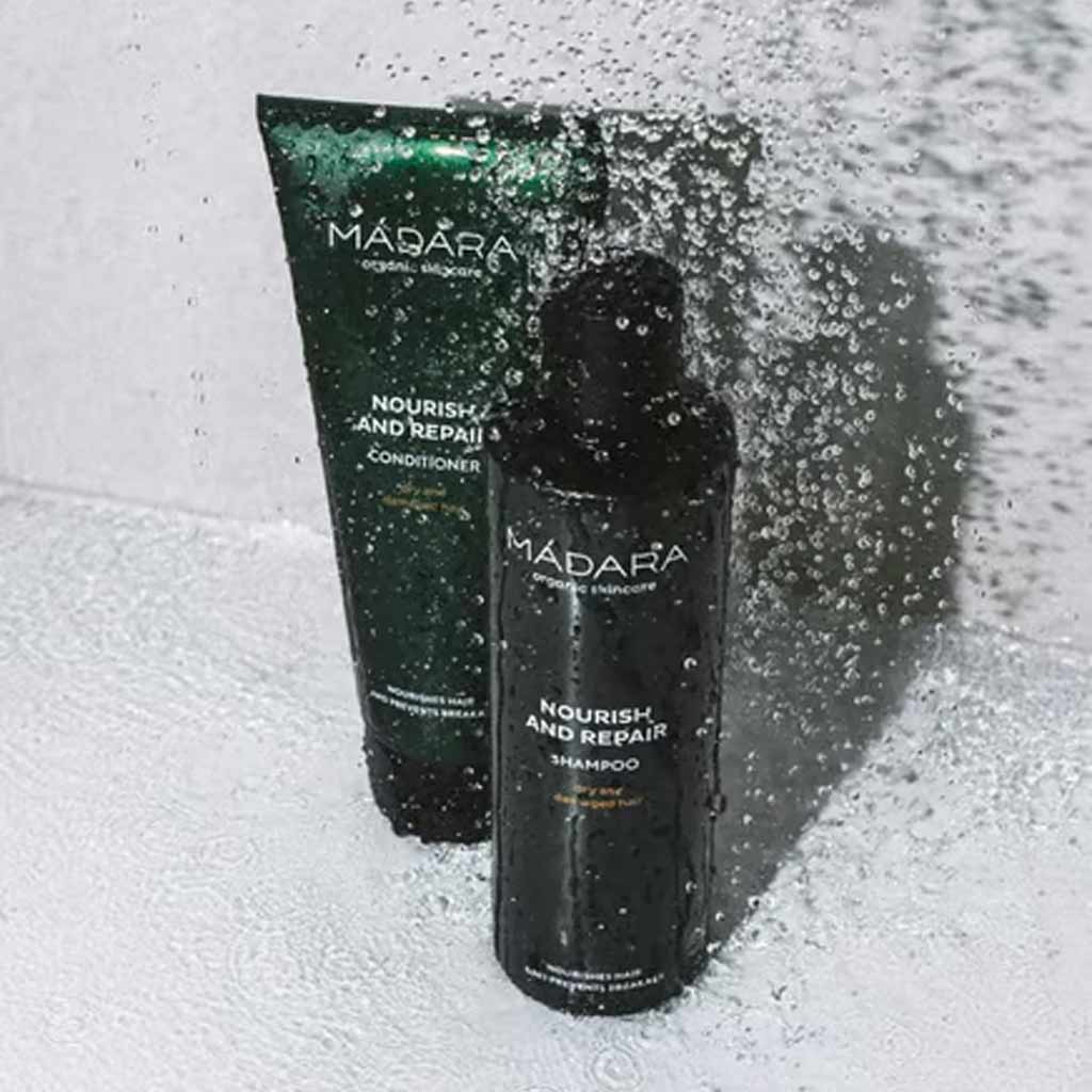 Madara Nourish and Repair Conditioner on täyteläinen hoitoaine, joka ravitsee syvältä ja korjaa kuivia, vaurioituneita hiuksia. Sisältää nokkosta, jossa on voimakkaita antioksidantteja A- ja E-vitamiineista sekä qvitten-hedelmää, jolla on ihoa pehmentävä ja kosteuttava vaikutus sekä antaa kiiltoa. Hoitoaine ehkäisee hiusten katkeamista ja haaroittumista. Tekee hiuksista silkkiset ja helpot muotoilla.