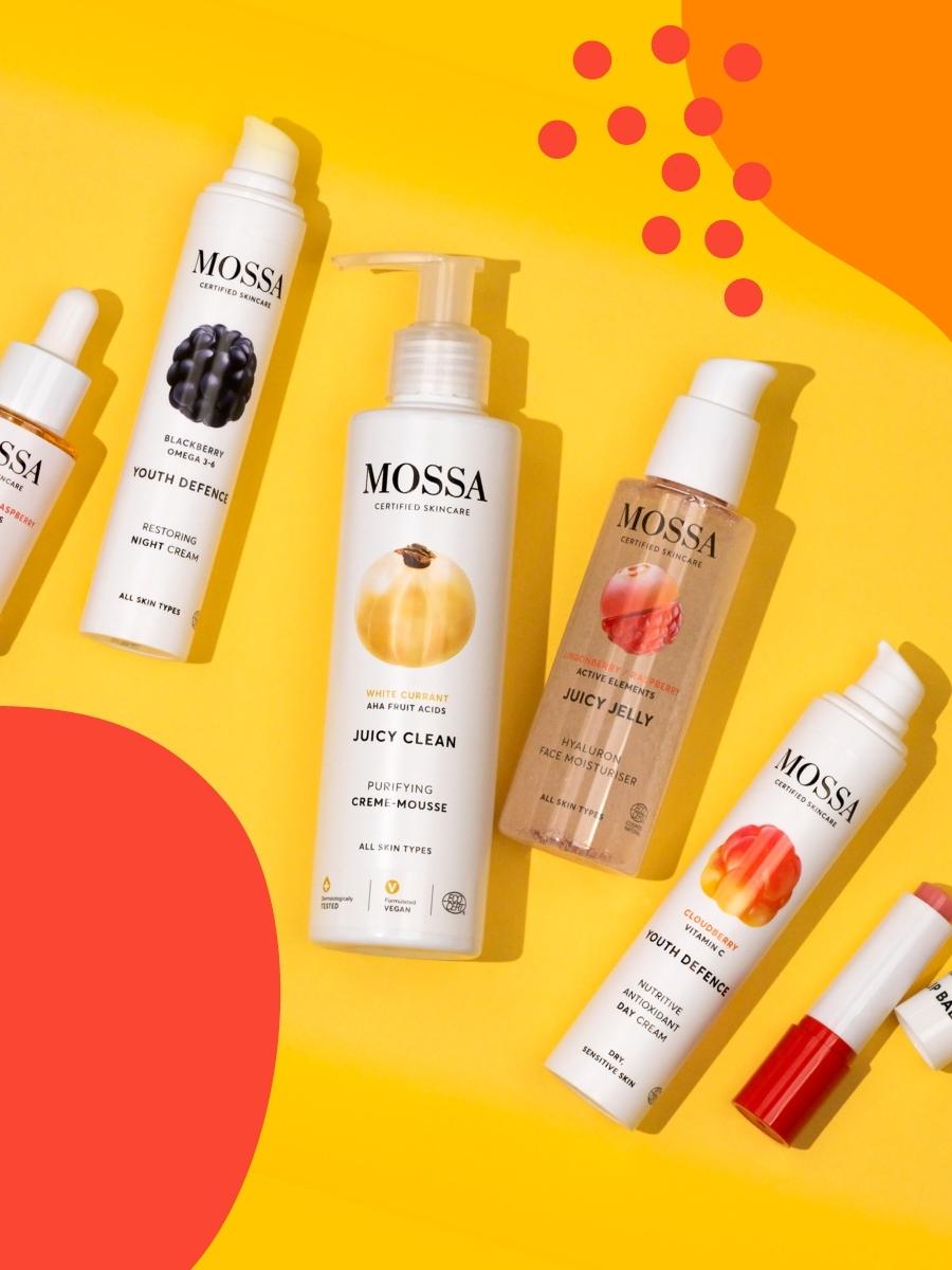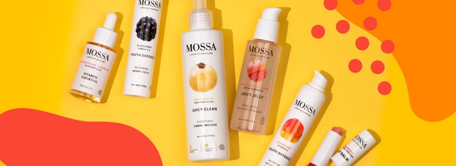 Mossa on luomulaatuinen ECOCERT-sertifioitu kosmetiikkasarja, joka sisältää raikkaita ja lempeitä tuotteita luonnolliseen päivittäiseen ihonhoitoon. Ihonhoitotuotteet perustuvat ainutlaatuisiin, pohjoisen marjoista saataviin vitamiinikoostumuksiin. Siksi ne sisältävät erittäin runsaasti vitamiineja ja vaikuttavia aineita. Iho tunnistaa luonnolliset ainesosat ja osaa käyttää niitä tehokkaasti hyödykseen. Valitse ihotyypillesi sopiva cocktail tyrnin, vadelman, karhuvatukan, luumun, lakan, mustikan ja valkoherukan parista. Mitään Mossa-tuotteita, tai niiden raaka-aineita, tai valmistuksen vaihetta, ei testata eläimillä. Kaikissa tuotteissa on anti-aging –vaikutteisia antioksidantteja.