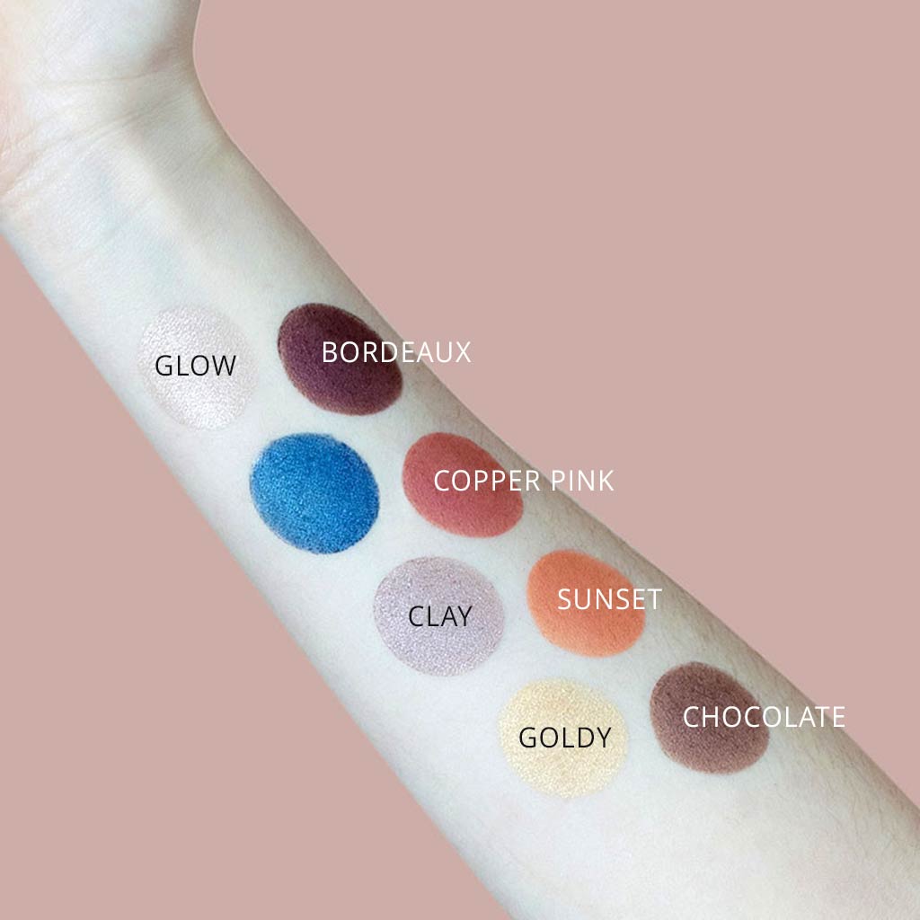 Copper Pink: MICA, CI 77891 (TITANIUM DIOXIDE), CI 77491 (IRON OXIDES), ZEA MAYS (CORN) STARCH*, SIMMONDSIA CHINENSIS (JOJOBA) SEED OIL*, RICINUS COMMUNIS (CASTOR) SEED OIL*, GLYCERIN**, ZINC STEARATE, BENZYL ALCOHOL, LECITHIN, PRUNUS ARMENIACA (APRICOT) KERNEL OIL*, DEHYDROACETIC ACID, TOCOPHEROL, ASCORBYL PALMITATE, CITRIC ACI, TIN OXIDE, AQUA (WATER).